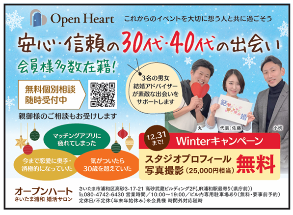 オープンハートさいたま浦和婚活サロンはさいたま市・浦和を中心にその他・東京や首都圏中心の会員様の婚活サポートをしております結婚相談所です。