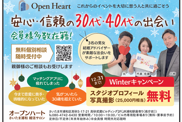 オープンハートさいたま浦和婚活サロンはさいたま市・浦和を中心にその他・東京や首都圏中心の会員様の婚活サポートをしております結婚相談所です。
