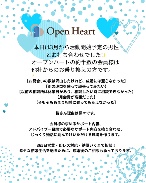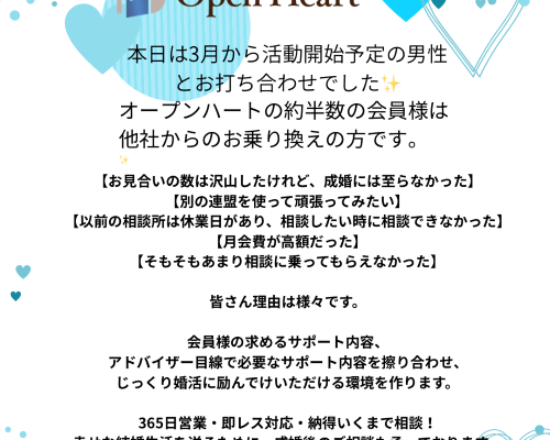 (それが悪いというわけではなく、会員様にそのサービス内容が合っているかどうかの問題です。ちなみにオープンハートは365日営業、アドバイザーは即レス対応です。)