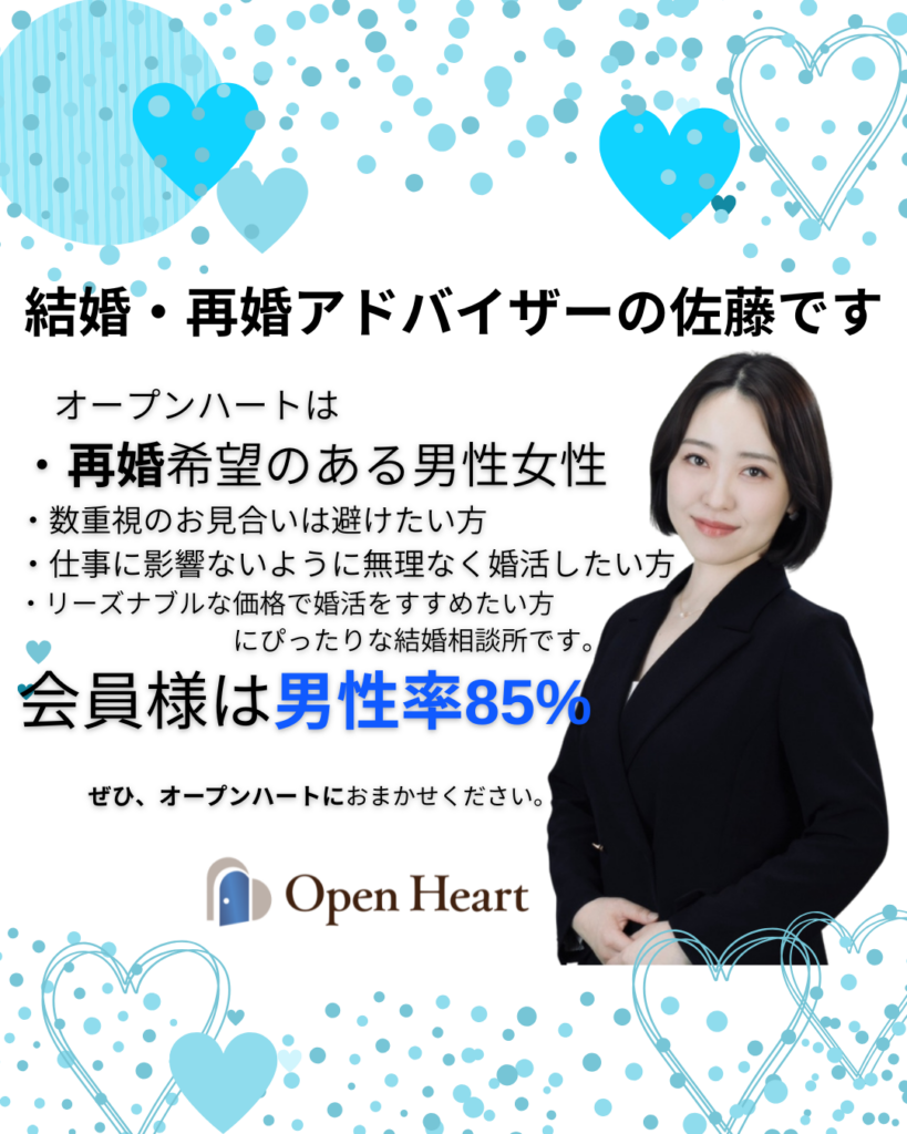 再婚希望の方、本当に多いです。オープンハートの会員様も30~40%は再婚希望の方です。